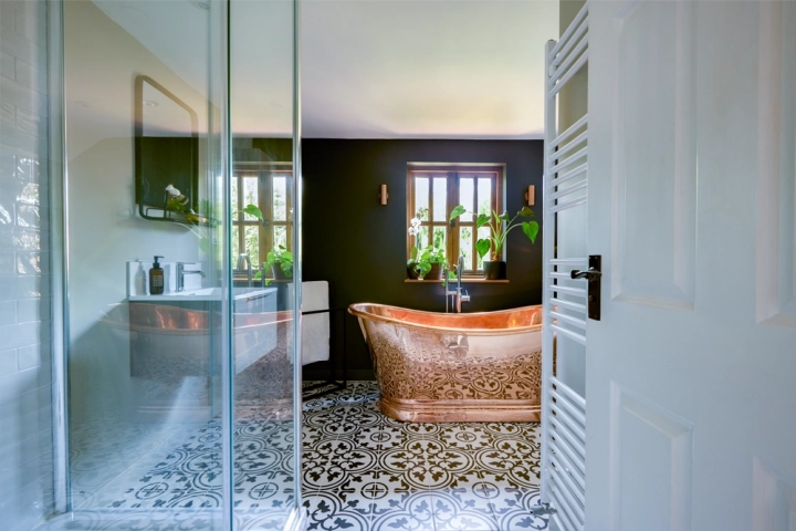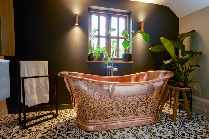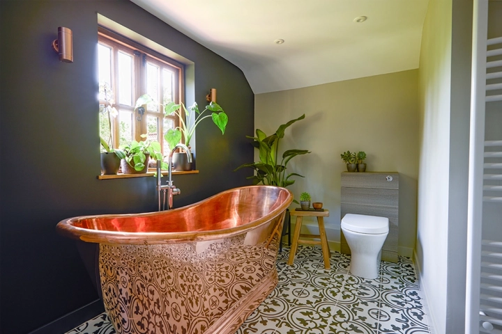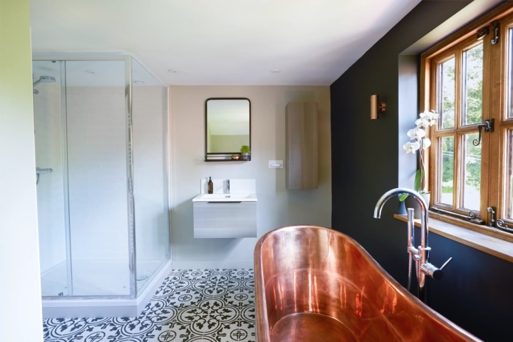 The centre piece of the bathroom was a traditional copper roll top bath with matching freestanding tap and mixer. It was important that the flooring choice complemented the copper bath both in colour and design. To this end a monochrome patterned tile was chosen which provided structure and enhanced the presentation of the copper bath.Modern-design cistern and basin units in natural tones worked well with the overall tone of the space in colour and material and a distinctive feature wall colour complimented the soft and muted tone of the rest of the room. The overall look provided a striking contrast of materials that worked beautifully together, combining to create an elegant and relaxing bathroom.
