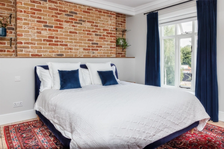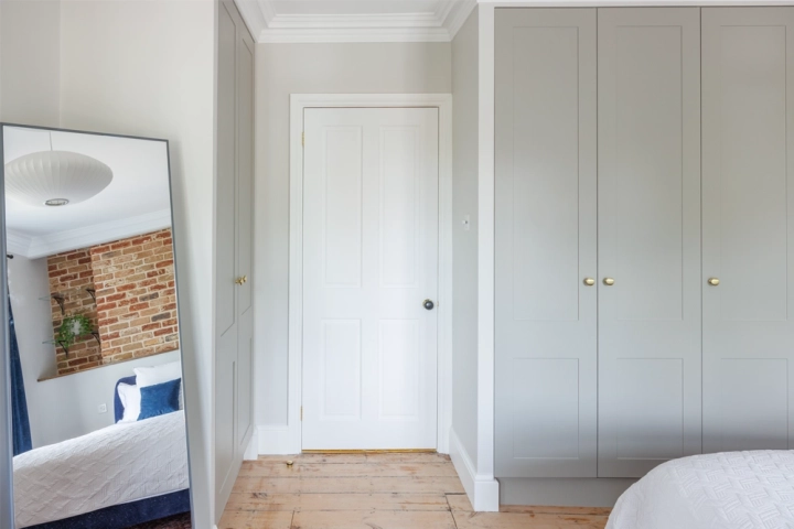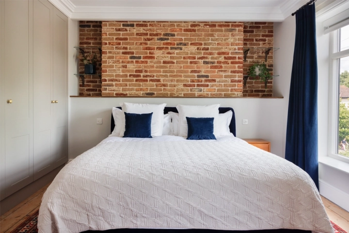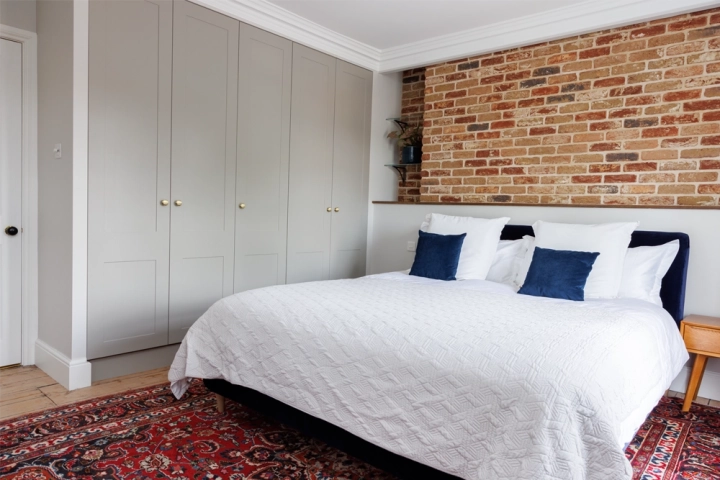 The bedroom was already a good size, and this allowed me to design fully built-in and bespoke wardrobes, with each internal space designed to my clients exact requirements. I knew there was a chimney breast behind one wall and really wanted to expose this and highlight the Victorian red brick to create a central design feature. Upon removal of the stud wall, we discovered that this was not going to be possible as the brick was not in a good enough condition and the brick did not stretch across the length of the wall as we had hoped. I therefore effectively created this look using beautiful brick slips and light lime mortar.