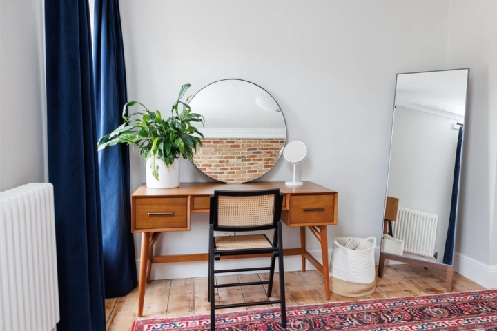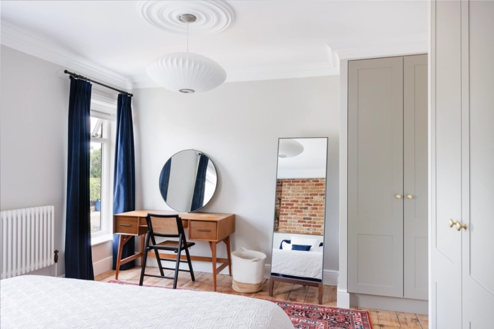 A mid-century dressing table and mirror and lighting tie in well with the other rooms in the house. Overall this bedroom has an understated, elegant quality to it whilst at the same time providing far better storage solutions and a more comfortable and inviting place to sleep.
