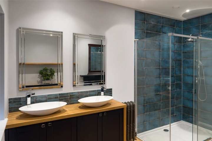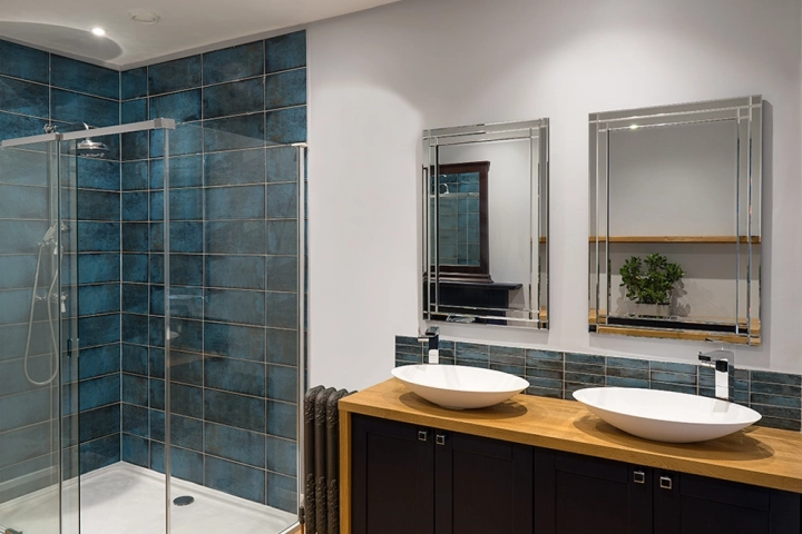 The bathroom itself is a good size and allows for a large shower enclosure, a double vanity unit, plenty of additional storage, and decorative shelving. I chose Original Style Monte Blanc tiles in blue for the shower and the matching mosaic wall tiles for behind the basins. These are truly beautiful tiles that add a touch of glamour.