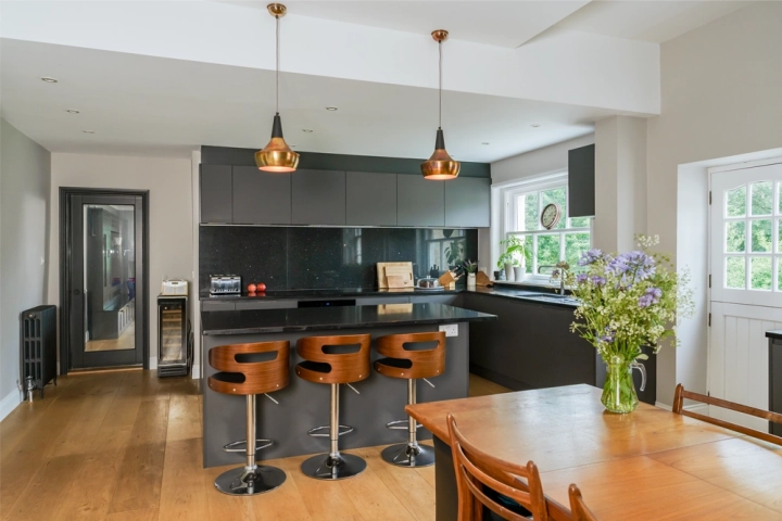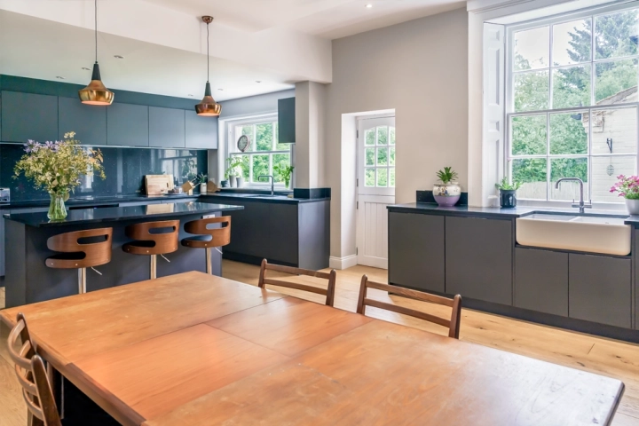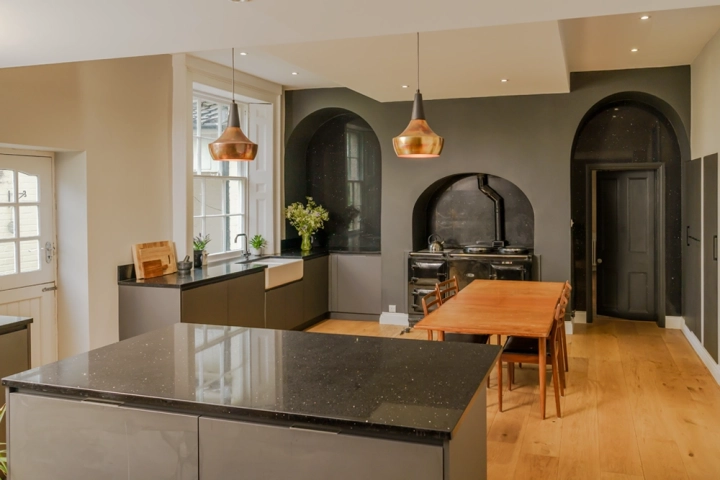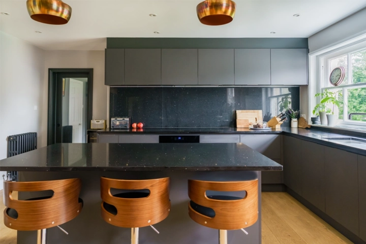 My clients like rich, strong colours, so I chose a dark green/grey handless kitchen door with a black quartz worksurface with small mirrored flecks to catch the light and add glamour. The room already had three archways and I really wanted to celebrate these, so using the same black quartz, I designed full height wall panels to be cut into these arches. As the room we were creating was going to be so big, these dark colours worked well. I added some warmth and texture with the solid oak flooring and beautiful copper lights.