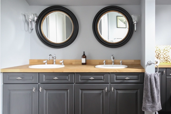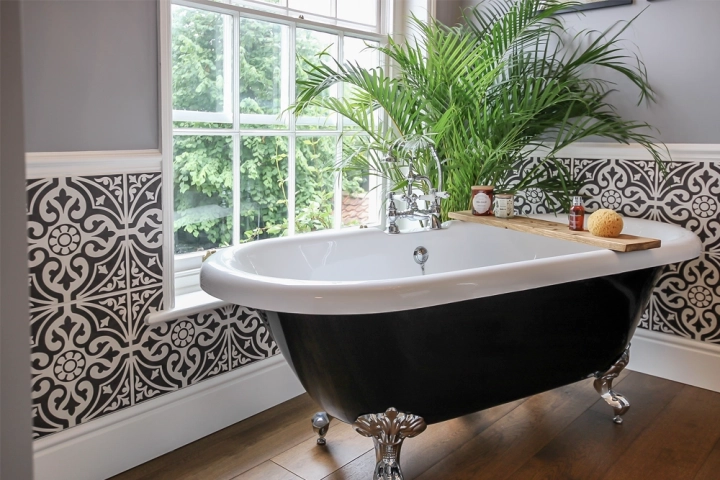 I chose a stylish palette of lead grey cabinets and doors, complimented by walnut worktops and natural engineered oak through the space. A Duke Grey traditional double ended roll top bath created a centerpiece, and the Black Devon Stone wall tiles created an elegant feature wall.