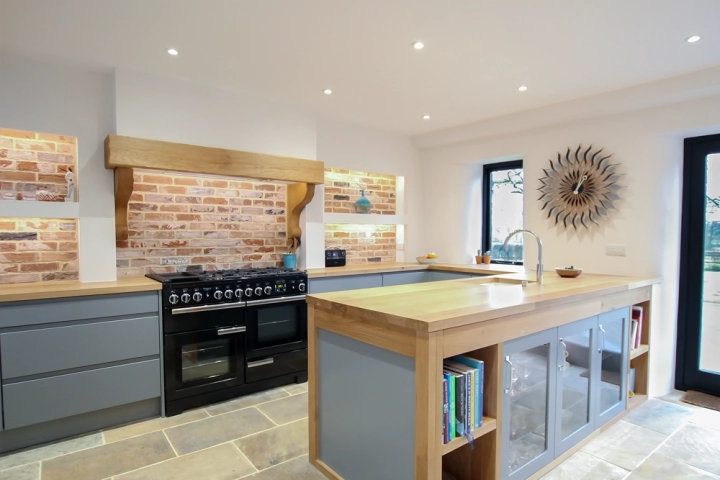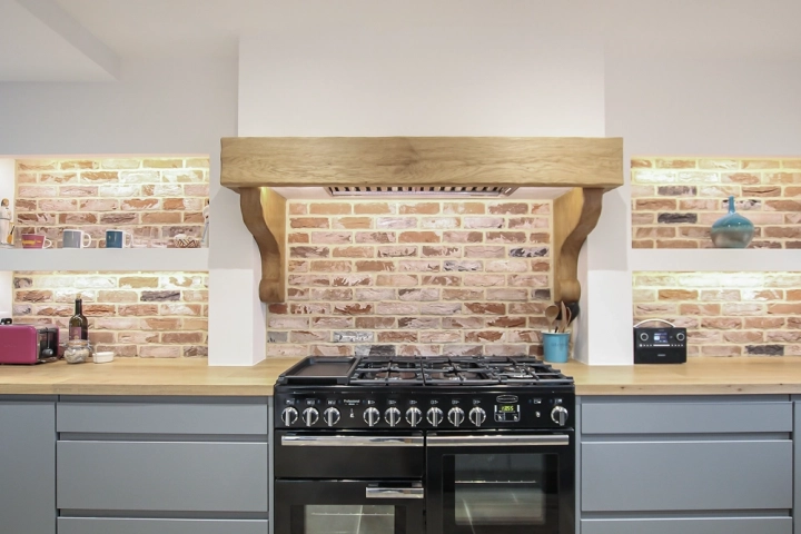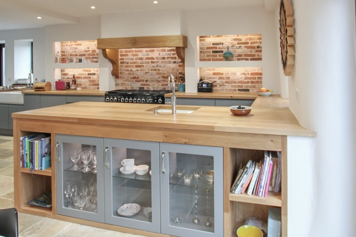 From the outset I knew that my design would require some highly specialised carpentry in order to achieve the stunning detailed finish I was aiming for. In particular the oak peninsular framed in oak with shelves and lit cupboards needed to be made in-situ as well as the worktop being made to fit around curved window recesses. The result was a wonderful bespoke peninsular with shelving and cupboards on one side, and ample drawer space on the other, framed in full stave oak.