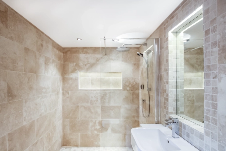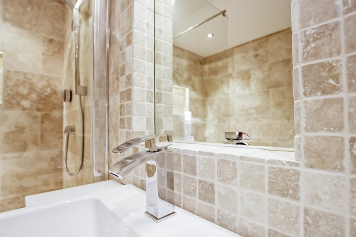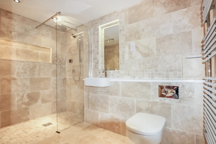 I preferred mosaic tiles in the shower area to create a unique transition from the main area of the room, as well as around the mirror to add a decorative element. In order for my design to work as effectively as it could, I created bespoke studwork to conceal the cistern and pipework. I included a semi-recessed basin and used the same travertine tiles with a removable access panel.