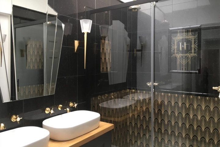 The guest bathroom is a jewel box of colour and texture. Rich Monte Blanc blue tiles and mosaics add glamour, balanced by warm oak flooring and bespoke cabinetry. Careful planning allowed for a walk-in shower with flush tray, overcoming previous plumbing limitations. Traditional fixtures, including cast iron radiators with daisy detailing, add character, while every element—from vanity units to towel rails—was designed to maximise both beauty and function. In addition the Art Deco style shower room is bold, glamorous and romantic, with a strong preference for black and gold colouring and a bespoke design Gatsby Monogram with the client’s initials, also printed onto vinyl on a glass splashback.