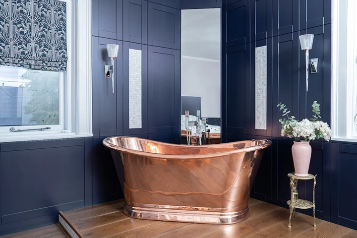 This breathtaking suite was designed with boutique hotel luxury in mind. At its heart is a stunning copper bath, positioned on a raised plinth inset with Mother of Pearl mosaic tiles. Bespoke panelling in Little Greene’s ‘Dock Blue’ wraps the room, integrating concealed storage and forming an elegant headboard. The design overcame significant logistical challenges to deliver a seamless blend of beauty and practicality, with custom detailing throughout—from the bath’s placement to the Art Deco-inspired furnishings.