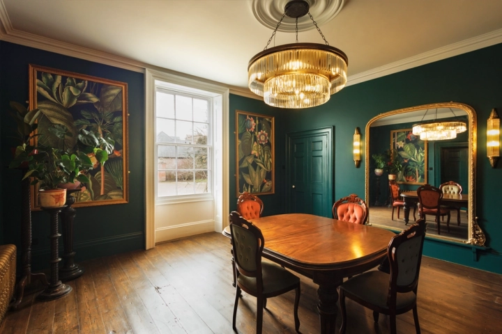 This dramatic space was designed to command attention. Mid Azure Green walls provide a bold canvas for bespoke fabric wall hangings, framed in gold for both elegance and practicality. An inset wood burner sits within a granite surround, and hidden storage has been integrated to house the leaves of a large antique dining table. Original floorboards were restored to preserve the home’s heritage, while an oversized crystal chandelier and antique radiators lend grandeur and warmth.