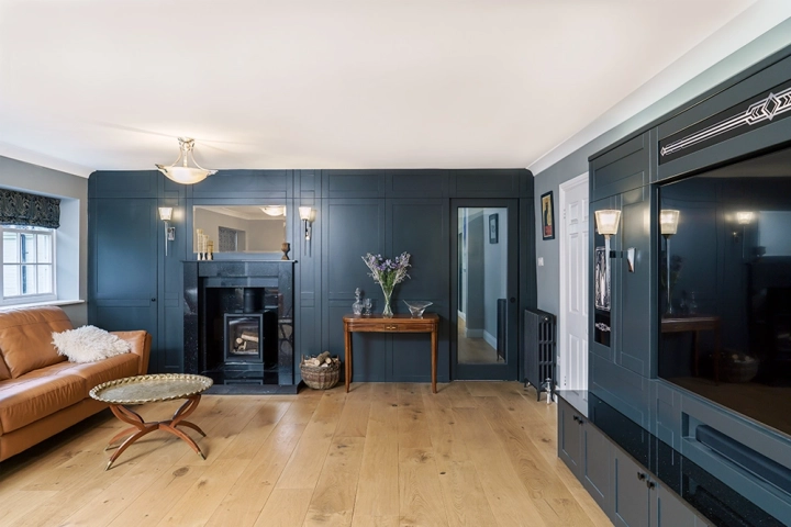 Flowing seamlessly from the kitchen, the cinema room reflects the client’s love of Art Deco design. Bespoke oak panelling incorporates mood-lit, monogrammed glass details, while a hidden pocket door allows for flexible use of space. A black granite fireplace, built-in cabinetry, and carefully integrated lighting create a space that is both cinematic and beautifully composed. Solid oak flooring continues through from the kitchen, uniting the two rooms with elegance and consistency.