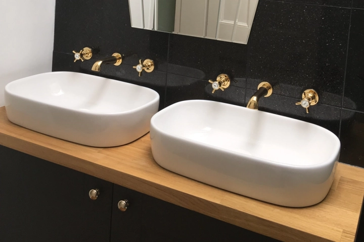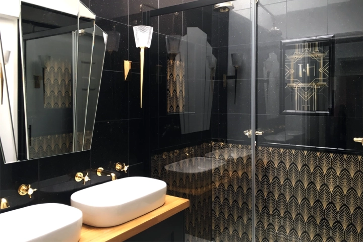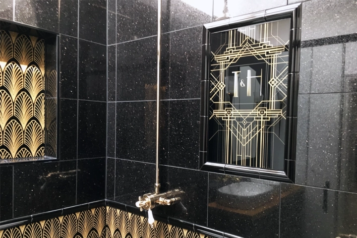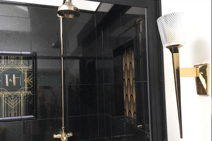 I chose a range of luxurious materials and patterns in the Art Deco style, predominantly focusing on gold and black detailing with additional complementary rich and warm tones of a dark walnut worktop. Black Star Galaxy granite wall tiles in the shower recess and basin wall made a real statement, along with the detailing border tiles.